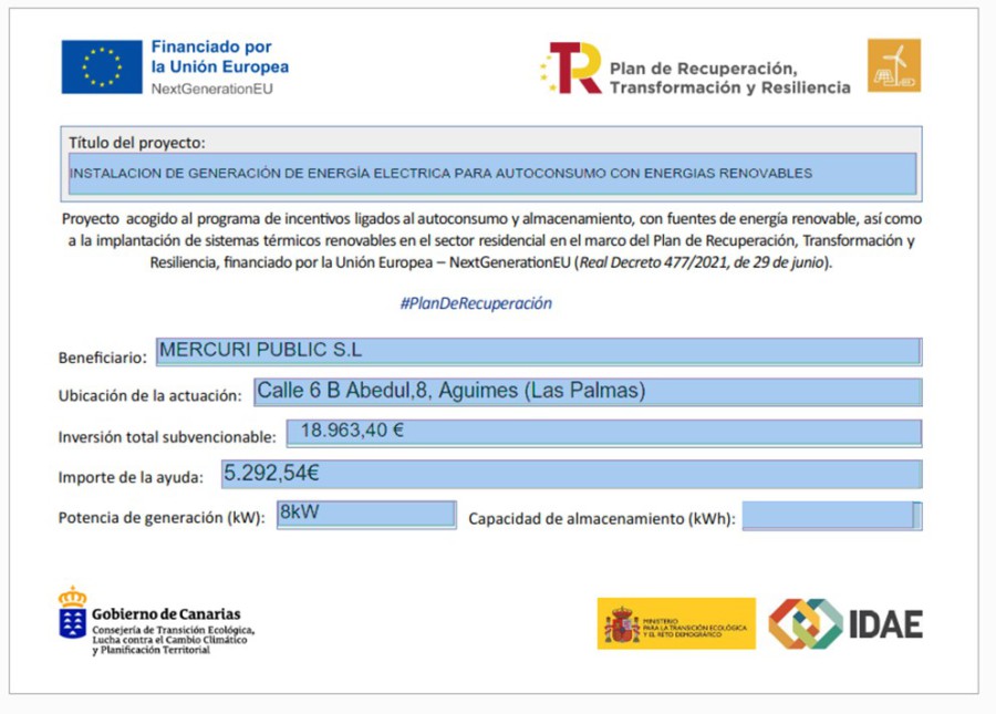 “En Mercuri Public SL estamos comprometidos con el medio ambiente, por lo que en el 2023 hemos instalado Paneles Solares Fotovoltaicos en nuestras instalaciones, proyecto acogido al programa de incentivos ligados al autoconsumo y almacenamiento, con fuentes de energía renovable, financiado por la Unión Europea con cargo al Fondo NextGenerationEU, en el marco del Plan de Recuperación, Transformación y Resiliencia, en colaboración con el ministerio para la Transición Ecológica y el Reto demográfico, a través del IDAE”